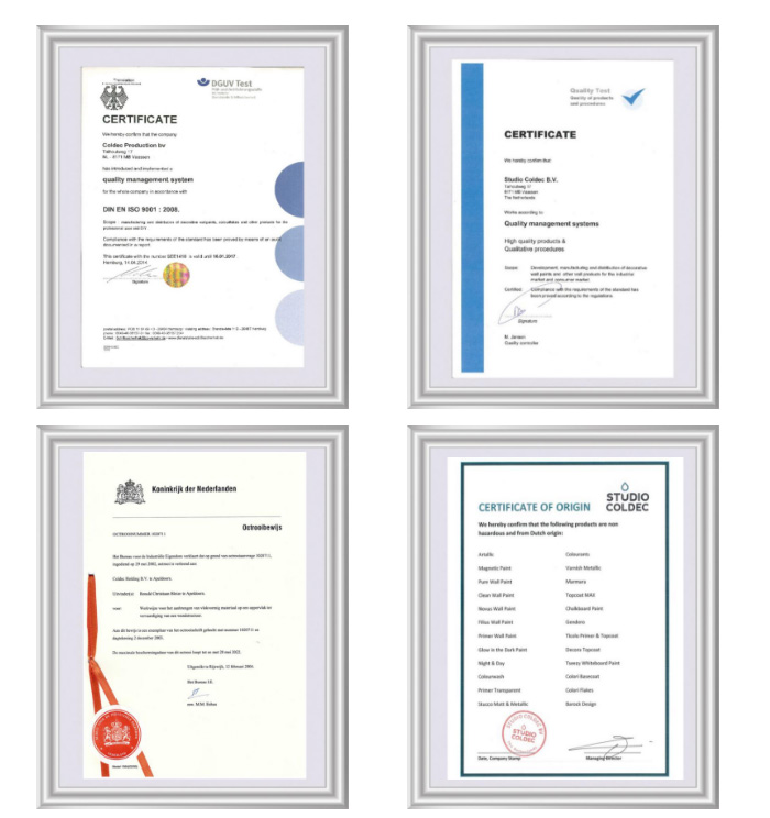 KOBELL科贝尔艺术涂料系列产品是集德国严谨制造工艺和领先科研技术为一体的顶级环保墙面装饰产品。德国公司总部系列家装涂料产品通过欧盟多国严格检验并获得一系列欧盟国家的权威认证,包括:VOC检测A+认证(法国室内环境检测最高环保标准)、美国LEED绿色建筑认证、REACH欧盟化学品管理认证、Certification for EPD 环保产品声明证书、BioCote抗菌技术认证。Responsible care产品安全保障标志、欧洲CE安全合格认证、芬兰M1环保标识认证、ISO 14001:2016环境管理体系标准认证、ISO 9001:2016质量管理体系认证等多项权威认证,以其优异的品质获得了多个权威机构的高度认可。